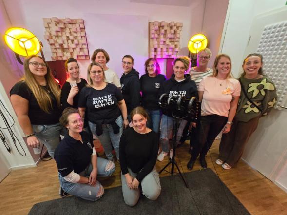 Direkt einige Tage später, am Freitag, den 4.10. fand der Damenausflug der Garde statt. Traditionell sind das Ziel und das Programm des Ausfluges immer geheim. Daher trafen sich 13 gut gelaunte Damen gegen 11 Uhr am Bahnhof in Oberlahnstein. Dort bekamen sie durch das Orga-Team Michéle Schmidt, Alex Kurz und Laura Fuß zunächst einen selbst genähten Funkenbeutel mit der nötigen Verpflegung ausgehändigt. Mit dem Zug ging es dann nach Köln-Deutz. Da das anvisierte Wirtshaus geschlossen war, denn „beim Lammi waren die Lichter schon aus“, wurde kurzer Hand das Sion-Brauhaus aufgesucht und bei kühlem Kölsch das Programm des Tages offenbart. Das Orga-Team hatte ein Tonstudio gebucht und die Damen konnten dort zwei Lieder zum Besten geben. Der ausgehändigte Text wurde bereits im Brauhaus eingeübt, sodass alle textsicher wurden. Im Tonstudio ging es nach einer kurzen Einführung direkt an die Mikros. Das Ergebnis bekam jede auf CD/MP3 inklusive eines Coverfotos ausgehändigt und es blieb sogar noch Zeit, das Funkenlied zu singen. Alle Teilnehmerinnen hatten sichtlich Spaß an dem Event. Mit einem guten Essen am Heumarkt ließ man den Abend ausklingen, bevor es mit dem Zug zurück nach Hause ging.