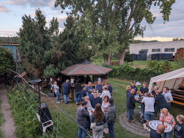 Am Samstag, den 18. August 2025 traf sich die Funkenfamilie zu ihrem traditionellen Sommerfest in einem bekannten Garten am Rhein. Nachdem tags zuvor viele fleißige Helfer beim Aufbau des Zeltes, der Sitzgelegenheiten und aller nötigen Dinge tatkräftig geholfen hatten, konnte das Fest um siebzehn Uhr beginnen. Gerd Schwan und Volker Kalb kümmerten sich meisterhaft um den Grill, das Salatbuffet ließ keine Wünsche offen und auch die Bar war gut bestückt. Als alle gesättigt waren, überraschten die Getränkeoffiziere die Gäste mit der Darbietung eines umgetexteten Liedes, wofür sie reichlich Beifall ernteten. Zudem waren alle Anwesenden aufgefordert, eine kleine Aufgabe für ein besonderes Foto zu erfüllen. So sollten sich zum Beispiel alle ehemaligen Kindertollitäten auf einem Foto verewigen oder auch Menschen mit anderen besonderen Merkmalen. Mit viel Spaß wurden die Aufgabenstellungen gemeistert und die nächste Fotoshow ist somit gesichert. Auch die Kinder kamen nicht zu kurz. So konnten sie Verstecken spielen und bei Einbruch der Dunkelheit mit der Taschenlampe umherstreifen. Die Funken bedankten sich bei Familie Schwan für die Bereitstellung des Gartens mit einem Präsent. Bis tief in die Nacht wurde gefeiert und erzählt. Beim Abbau und Aufräumen am nächsten Morgen waren sich alle einig, dass es wieder einmal ein gelungenes Fest war.